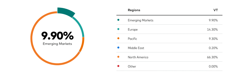 そこで筆者の今年のRoth IRAのポートフォリオは無難に、SP500連動のETFで私の分を。VTで旦那の分を埋めました。VTには33.7%ほど世界株(アメリカ以外)が入っているので二人分の今年のIRAは以下の配分に落ち着きました。