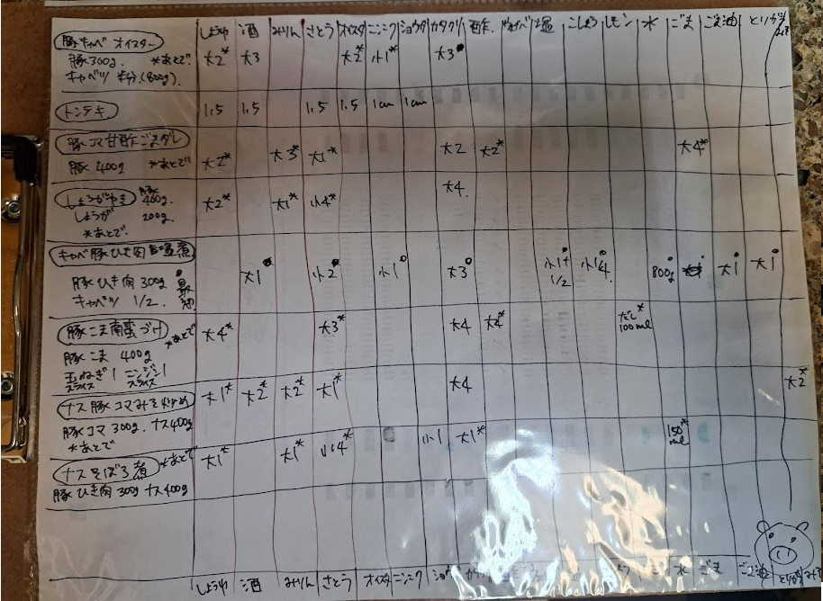 実際のレシピ表の写真です。あまりに雑ですが、一気見できて調理中スマホを触ることなく調理を進めることができます。